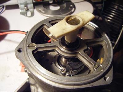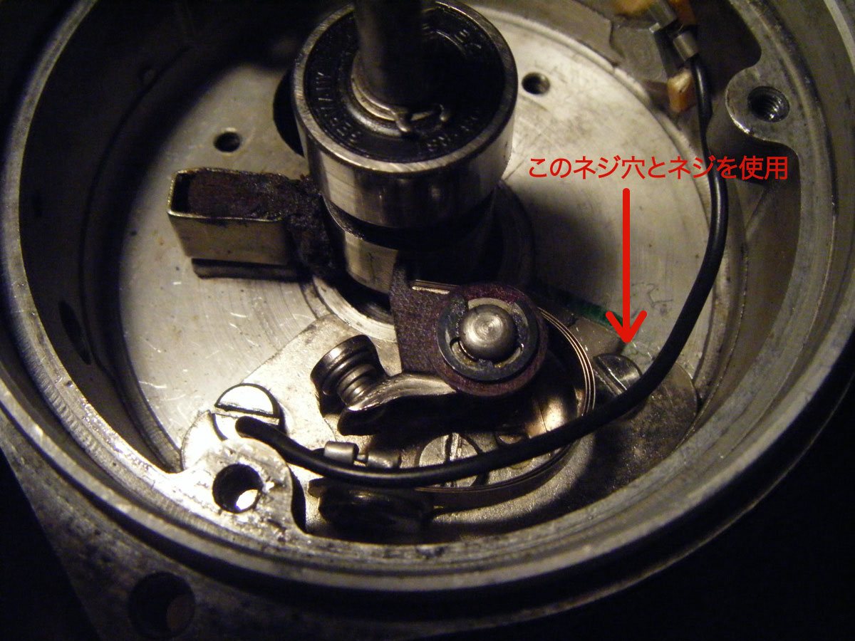 を外し、デスビ上部のカバーも外すとポイントが見える。ポイントとデスビ側面にあるコンデンサーを撤去する。矢印のネジとネジ穴を使ってIgnitor