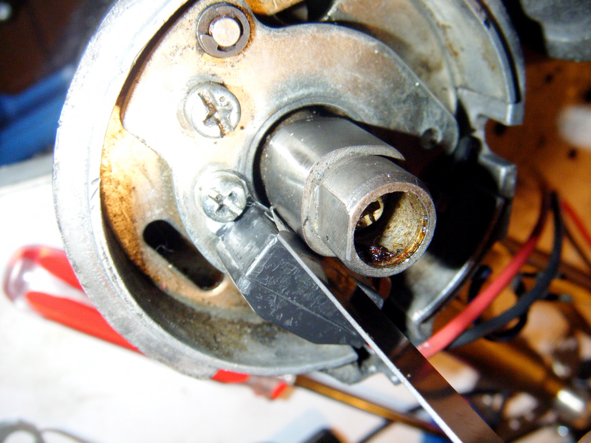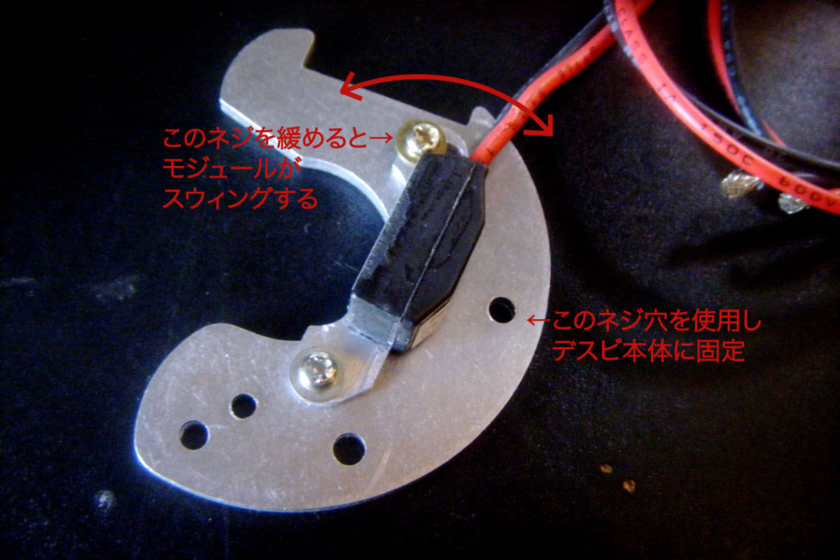 シクネス(隙間)ゲージを使ってポイントカムの頂点とモジュールの間隔を決める。0.5〜0.7ミリが最適。(画像は他のデスビにつき参考画像)