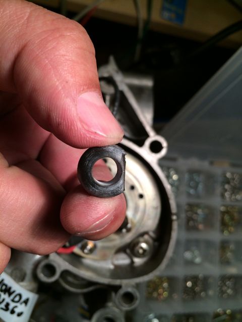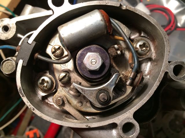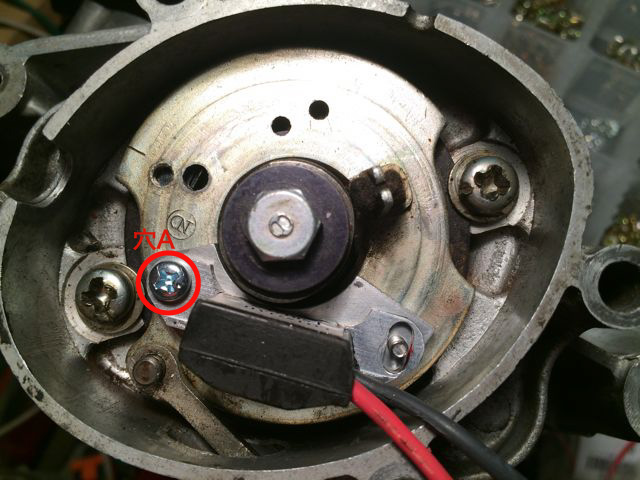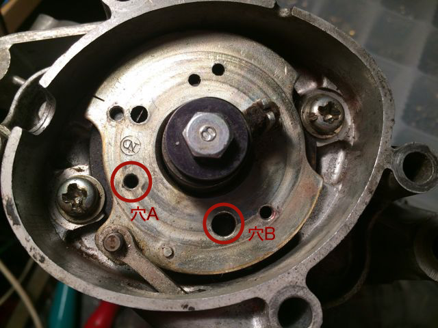 ポイント・コンデンサー、グロメットを外します。見えてきた二つの穴A、Bを使用します。