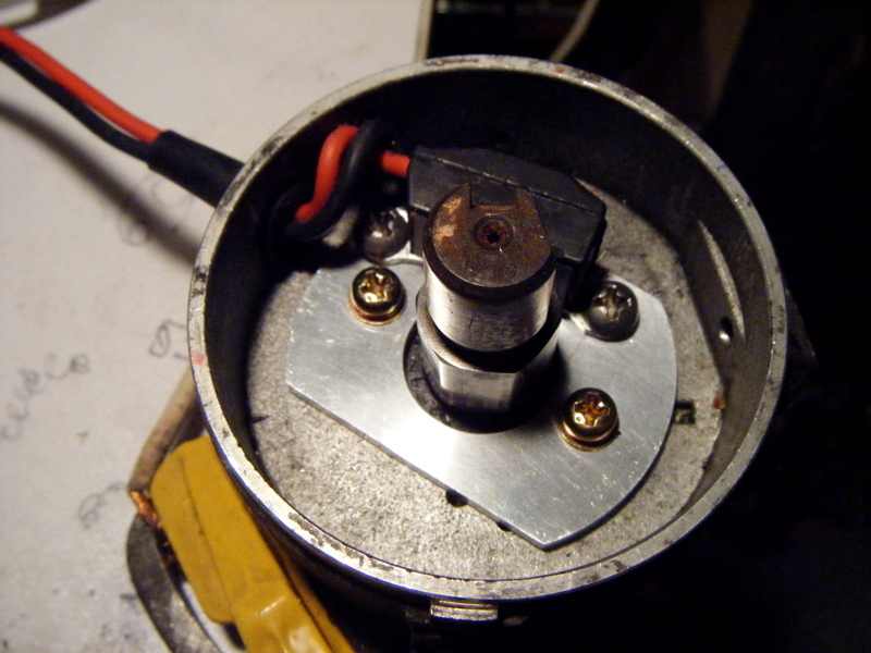 IGNITOR本体をデスビにネジとめします。ベースプレートは二通りの止め位置が可能ですが、ポイントがついていた側と向かい合わせになる位置です。お間違いなきよう。デスビによっては配線取り出し穴の位置が違っている場合がありますので、画像の穴位置を頼りに取付けしますと本来の正しい取付け位置と逆側になってしまう場合があります。お気をつけ下さい。