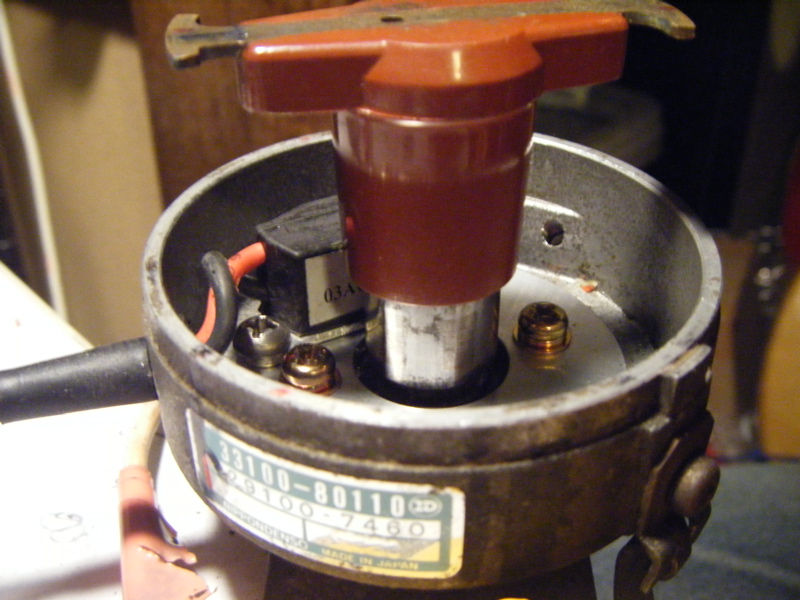 デスビキャップを外し、ローターも外します。ポイントを外す前にポイントの付いている場所をよく覚えておいて下さい。