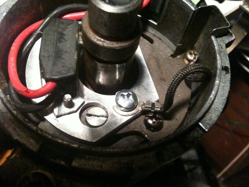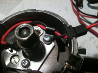 ポイントを止めていたネジを使ってIGNITORをポイント跡にネジ留めします。この時、配線ガイドとアースコードを共締めすることをお忘れなく。配線は回転するローターに絶対に干渉しないように、IGNITORモジュールの背後を通します。写真をよくご覧頂くと、配線を外側にむけて捻っているのが見えます。これにより配線が上向きに浮き上がってローターに干渉することを防ぎます。