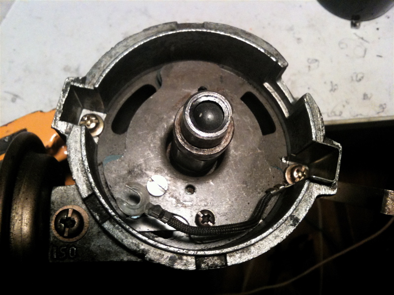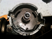 デスビキャップ、デスビローターを外すとポイント・コンデンサー・配線が見えます。これら全てをを外します。