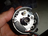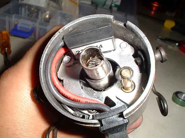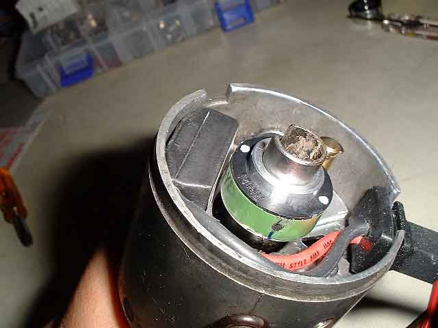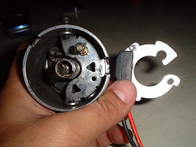 デスビ内からポイントを外します。IGNITOR本体はこのような位置関係でデスビ内に収まります。