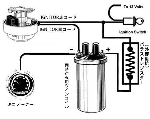- コイルと外部抵抗の抵抗値の合計が3Ω未満の場合、IGNITOR〜コイル一次側に流れる電流が大きくなりすぎ、コイルが 焼き付いた入りIGNITORが焼損したりします。こうした場合は保証対象外となりますので十分ご注意下さい。