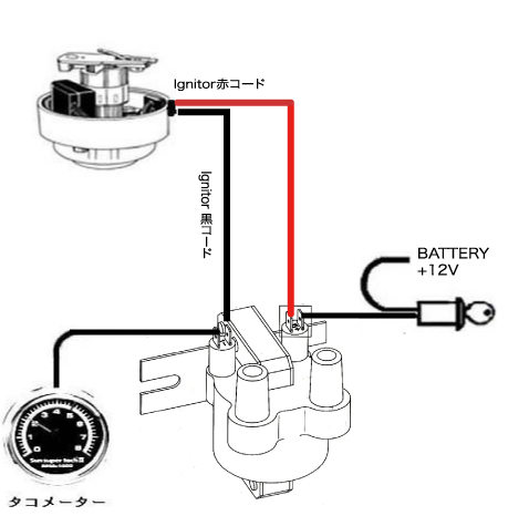 - 電気式タコメーターを使用する場合、IGNITORの黒コード(=コイルのマイナス端子)から取るのが普通ですが、電流検知式タコメーターの場合は配線が異なります。タコの針が踊ってしまうような場合には対策方法を当店までご相談下さい。又、スミス製の旧式のタコ等、古いタイプのタコメーターには作動しないものもあります。