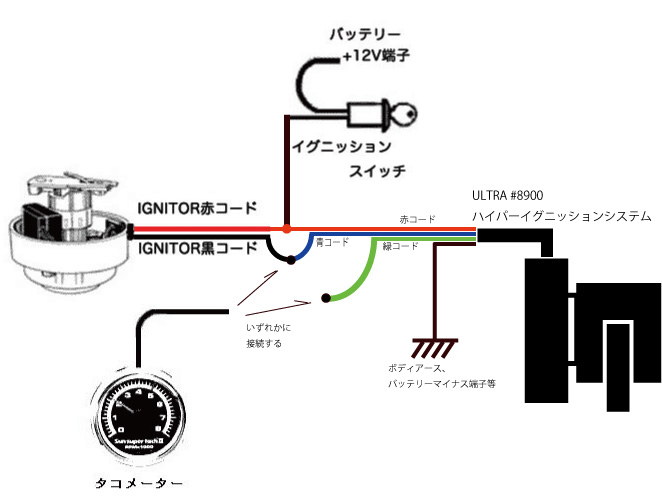 - IGNITORの赤コードとハイパーイグニッションシステムをイグニッションスイッチラインに繋ぎます。
