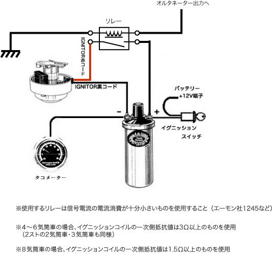 IGNITORは赤コードから電源を供給して作動しますので、エンジン停止中に赤コードに電圧がいかなければIGNITORはそもそも作動しません。オルタネーターの出力をリレーのトリガーにすることで、オルタ(即ちエンジン)が回転して初めてIGNITORに電源が供給されるようになります。