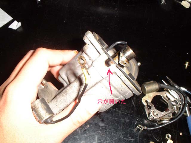 デスビキャップ、デスビローターを外すとポイントと配線が見えます。これらを外します。