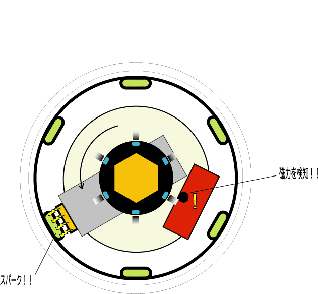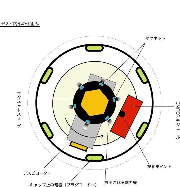 | デスビキャップとローターの点火位相 ここでは、これまで日本ではあまり語られてこなかった、「点火時に於けるデスビキャップとローターの位相関係」について解説します。 通常点火における時間軸上の事項に関してはすべて「点火時期」という言葉で片づけられてしまいがちですが、この点火時期というのは、クランクシャフトの回転に対して点火系がどのくらいの進角/遅角で点火するか、ということを表わすものです。今回のテーマである点火位相というのは、点火の際にデスビの内部でローターの先端とキャップの電極がきちんと向きあっているか否かということを言うものです。 ![]() 上の図は、正常なデスビ内部の点火のメカニズムを描いたものです。デスビシャフト上にあるポイントカムにマグネットスリーブを被せますと、カム山の位置に、6気筒車であれば6個のマグネットが、4気筒車であれば4個のマグネットが配置されることになります。 この磁石から出る磁力線がIGNITORモジュールの検知ポイントに検地されますとIGNITORはコイルの一次側の電流を遮断し、プラグに点火します。つまり、この磁力線が検知さる点火の瞬間に、ローターはキャップの電極と向き合っていなければいけません。従いまして理想的な状態は以下の図のようになります。 ![]()