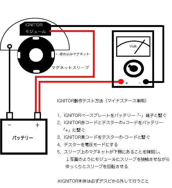 テスターにはまずバッテリー電圧が表示されます。センサーに磁力が検知された瞬間、電圧が0ボルト付近まで落ちます(0.2〜0.3ボルトの場合もあり)。 その後またバッテリー電圧に戻ります。0ボルトに落ちる位置は非常に狭いわずかな角度ですので、マグネットスリーブはごくゆっくり回して下さい。まわしていくとテスターはバッテリー電圧と0ボルトとを交互に表示します。テスターの電圧表示が動かない場合、IGNITORの故障が考えられます。