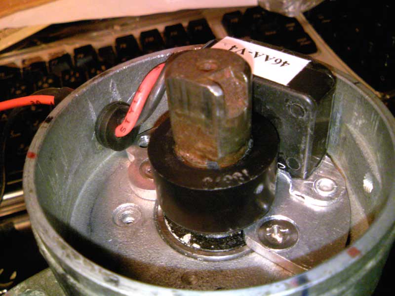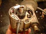マグネットスリーブを被せます。かなりタイトで堅いので、慎重に挿入して下さい。ポイントカムの6角とスリーブ内径の角がぴったりあうように位置をあわせ、上からローターをあてて軽くそっとハンマー等で叩いていきます。 |