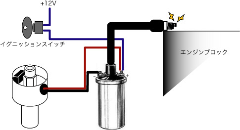 エンジンがかからない場合、配線の間違いの可能性も考慮にいれ、図のように最もシンプルな配線でコイルをつなぎ、コイルに直接プラグコードを刺し、スパークプラグをエンジンブロックの上に置いてプラグの金属部分がエンジンブロックに触れるようにします(←ここが重要)。